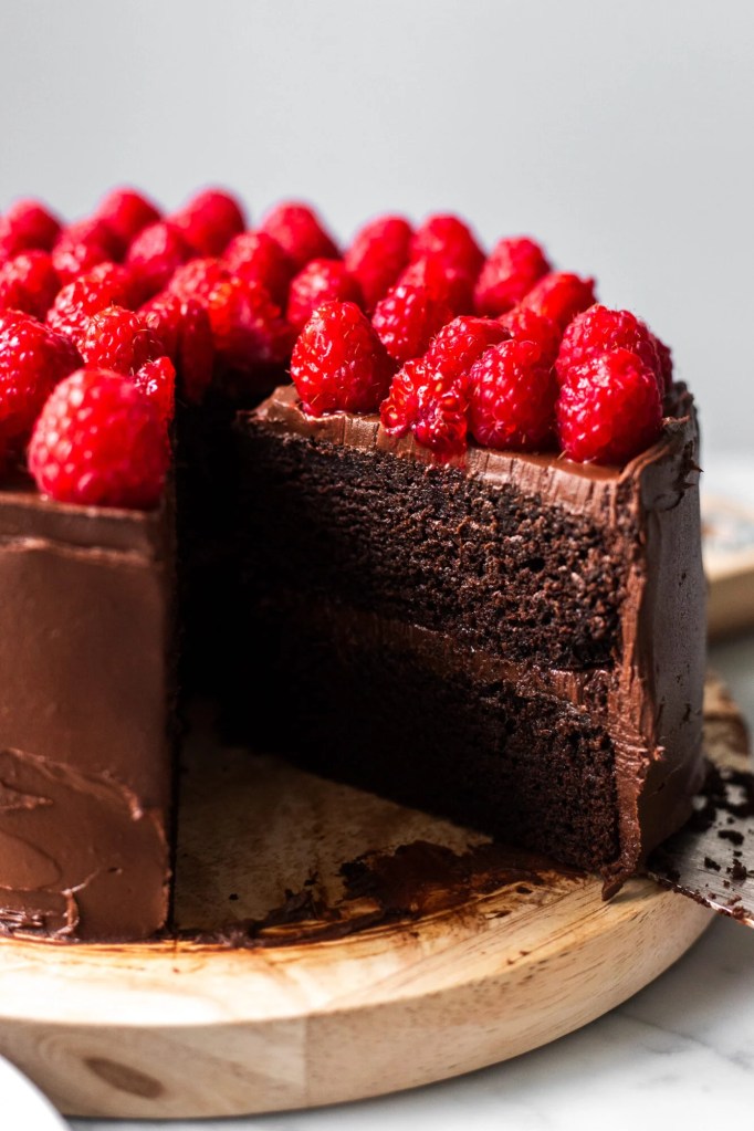 Three layers covered in a glossy ganache with raspberries delicately arranged in a circle around the edge.